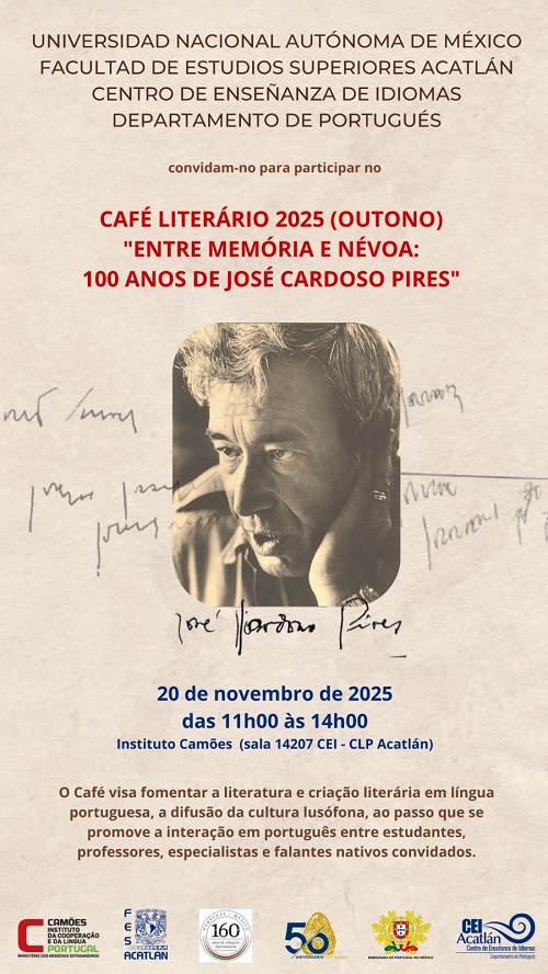 O Café Literário vai decorrer no dia 20 de novembro de 2025, entre as 11h00 e as 14h00, no Camões - Centro de Língua Portuguesa na Cidade do México, localizado na Universidad Nacional Autónoma do México (UNAM), com o objetivo de celebrar o centenário de José Cardoso Pires.