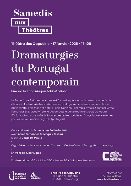 No âmbito da iniciativa Samedis aux Théâtres, o público luxemburguês terá a oportunidade de descobrir, no mês de janeiro de 2026, no Théâtre des Capucins, quatro excertos de textos de autores portugueses contemporâneos, selecionados pelo encenador e ator Fábio Godinho.