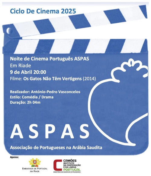 No âmbito do ciclo de cinema português, será exibido no dia 9 de abril, pelas 20h00, na residência do Embaixador de Portugal na Arábia Saudita, o filme “Os gatos não têm vertigens" (2014), do realizador António Pedro Vasconcelos.