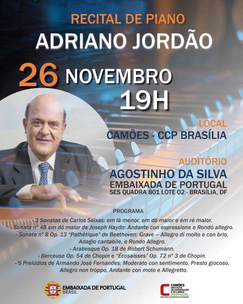 No dia 26 de novembro de 2025, pelas 19h00, o pianista português Adriano Jordão regressa a Brasília, para apresentar um recital no Auditório Agostinho da Silva, na Embaixada de Portugal / Camões - Centro Cultural Português em Brasília.