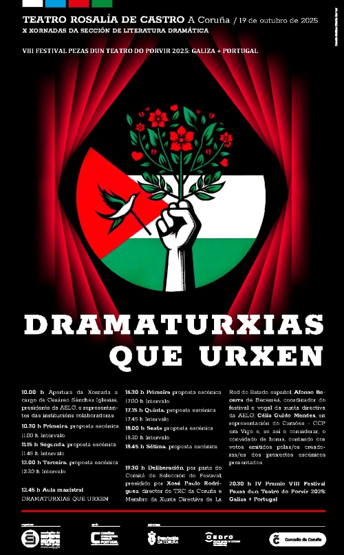 No dia 19 de outubro de 2025, entre as 10h00 e as 21h00, terá lugar, no Teatro Rosália de Castro, na Corunha, o VIII Festival Peças de um Teatro do Porvir 2025, organizado pela Asociación de Escritoras e Escritores en Lingua Galega (AELG), com o apoio do Camões - Centro Cultural Português em Vigo.