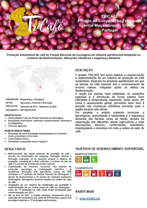 O projeto TRICAFÉ tem como objetivo a caracterização e implementação de um sistema de produção de café sustentável, integrado no ambiente agroflorestal, em que as plantas do café crescem sob o sombreamento de árvores nativas, mitigando assim os efeitos da desflorestação.