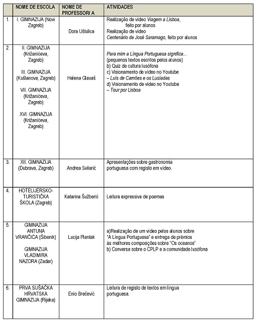 Escolas GIMNAZIJA (Križanićeva, Zagreb), GIMNAZIJA (Kušlanova, Zagreb), GIMNAZIJA (Križanićeva, Zagreb) e GIMNAZIJA (Križanićeva, Zagreb): "Para mim a Língua Portuguesa significa...", pequenos textos escritos pelos alunos; Quiz de cultura lusófona; Visionamento dos vídeos no Youtube "Luís de Camões e os Lusíadas" e "Tour por Lisboa" - professora Helena Glavaš.