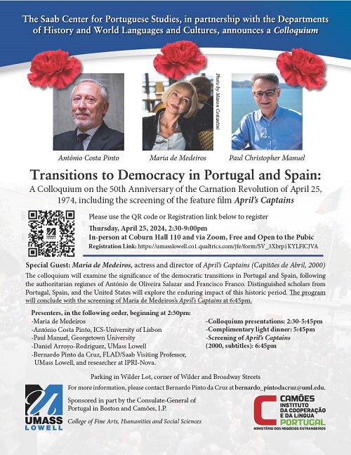 Com o apoio do Consulado Geral de Portugal em Boston e do Camões, I.P., o UMass Lowell Saab Center for Portuguese Studies vai realizar, no dia 25 de abril de 2024, um colóquio integrado nas comemorações dos 50 Anos do 25 de Abril intitulado Transitions to Democracy in Portugal and Spain.
