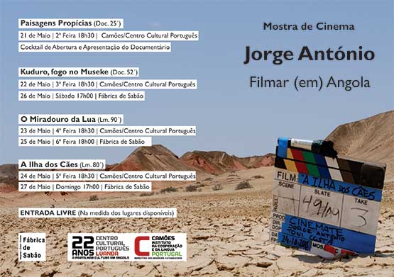 No dia 21 de Maio de 2018 (2ª feira), pelas 18H30, o Camões – Centro Cultural Português (Av. de Portugal, nº 50) dará início à Mostra de Cinema JORGE ANTÓNIO – FILMAR (em) ANGOLA, do cineasta português radicado em Angola, há quase trinta anos. Os quatro filmes que serão exibidos nesta Mostra resumem, em tempos diferentes e temáticas específicas, a relação profissional do artista, mas também a relação muito pessoal do homem com o país que o acolheu.