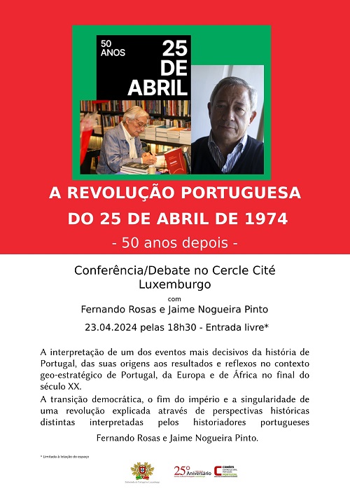 Terá lugar no dia 23 de abril de 2024, na cidade do Luxemburgo, uma conferência-debate com os consagrados historiadores portugueses Fernando Rosas e Jaime Nogueira Pinto, moderados por Régis Moes, conservador no Museu Nacional de Arqueologia, de História e de Arte do Luxemburgo para a História Contemporânea.