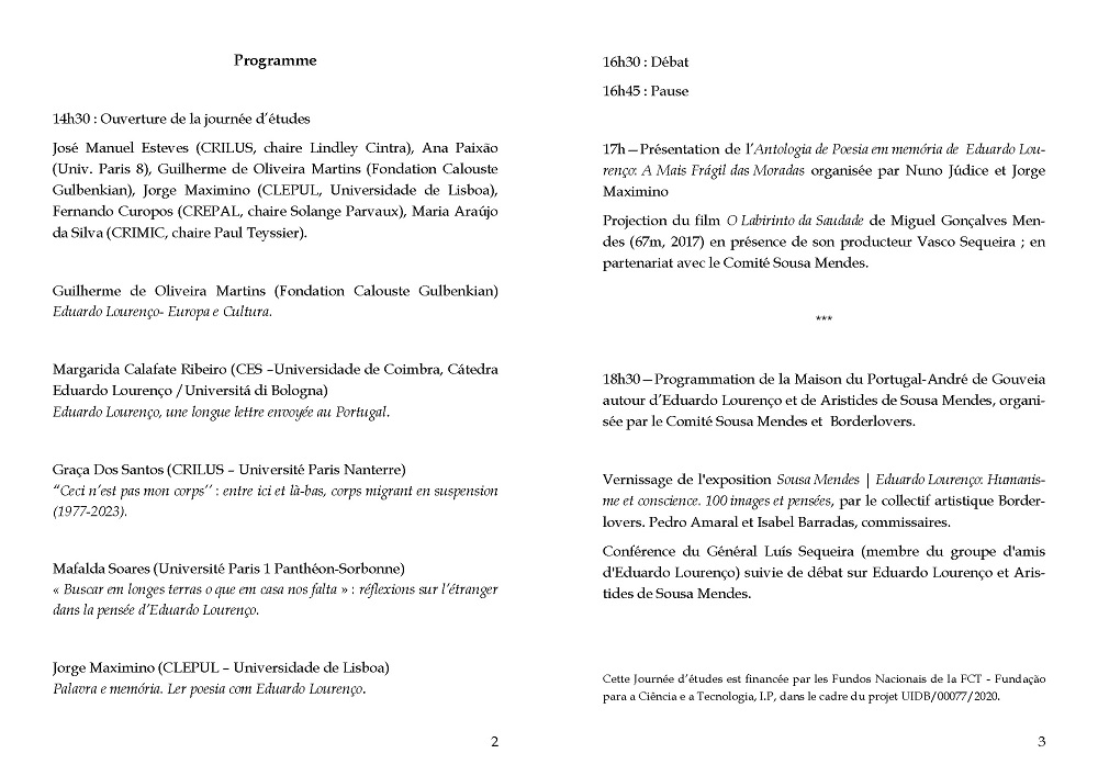 O seu pensamento será sucessivamente evocado pelas intervenções de: Guilherme de Oliveira Martins – "Eduardo Lourenço-Europa e Cultura"; Margarida Calafate Ribeiro – Eduardo Lourenço, une longue lettre envoyée au Portugal; Graça Dos Santos – "Ceci n’est pas mon corps’’: entre ici et là-bas, corps migrant en suspension (1977-2023); Mafalda Soares – «Buscar em longes terras o que em casa nos falta»: réflexions sur l’étranger dans la pensée d’Eduardo Lourenço; e Jorge Maximino – “Palavra e memória. Ler poesia com Eduardo Lourenço”.