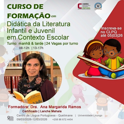 Irá decorrer entre 9 e 12 de março de 2026, nas instalações do Camões - Centro de Língua Portuguesa (CLP) em Quelimane, o Curso de Formação “Didática da Literatura Infantil e Juvenil em Contexto Escolar”.