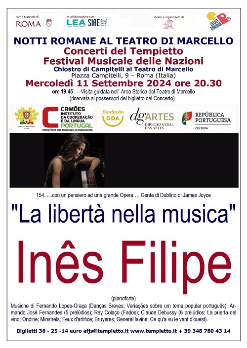 No dia 11 de setembro de 2024, às 20h30, Inês Filipe, uma das principais pianistas portuguesas da sua geração, realizará um recital no Claustro Campitelli do Teatro de Marcelo, em Roma, no âmbito do Festival “Concerti del Tempietto”.