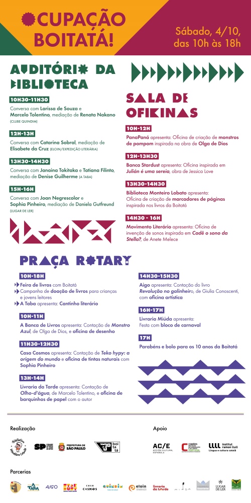 No dia 4 de outubro, entre as 10h00 e as 18h00, em parceria com a Biblioteca Infantojuvenil Monteiro Lobato, a Boitatá (chancela da editora Boitempo) celebra 10 anos de existência.