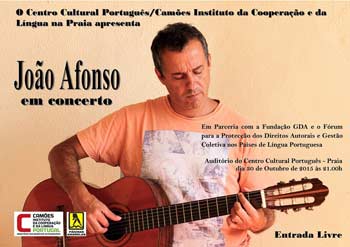 Realizou-se no Auditório do Centro Cultural Português na Praia, no dia 30 de outubro, um concerto do músico português João Afonso. Sob o título “Verde para crer” este concerto traduz um encontro entre a voz e a guitarra numa viagem pelos universos musicais percorridos por este cantautor numa presença intimista. Organização: Centro Cultural Português na Praia, Fundação GDA e Fórum para Proteção dos Direitos Autorais e Gestão Coletiva nos Países de Língua Portuguesa |