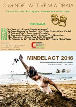 O Camões - Centro Cultural Português na Praia, em parceria com a Associação Mindelact, promoveu a Extensão à Cidade da Praia da XXIIª edição do Mindelact - Festival Internacional de Teatro do Mindelo. Entre os dias 15 e 30 de setembro de 2016, estiveram em cena 6 espetáculos. A importância deste evento, que há muito se afirmou como um dos pontos mais altos da agenda cultural de Cabo Verde e o mais relevante em matéria de artes cénicas, contempla a participação de companhias nacionais e internacionais que, num regime de itinerância, partilham com o público as suas produções. Organização: Centro Cultural Português na Praia e Associação Mindelact |