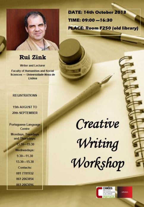 WINDHOEK | Universidade da Namíbia | 14-10-2013 — 15-10-2013 Curso de Escrita Criativa com Rui Zink Rui Zink é responsável por um curso de Escrita Criativa e por uma palestra sobre “Literatura e Humor” a realizar na Universidade da Namíbia, em Windhoek. O curso de Escrita Criativa, de entrada livre e gratuita para todos os alunos e professores de instituições de ensino superior, que no final receberam um certificado de participação. No dia 15 de outubro, após uma sessão de autógrafos no auditório do Centro de Língua Portuguesa Diogo Cão o escritor proferiu uma palestra subordinada ao tema “Literatura e Humor”. Organização: Centro de Língua Portuguesa Diogo Cão
