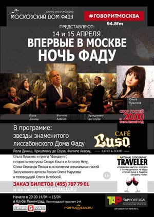 Duas noites de fado tiveram lugar em Moscovo, na sala de concertos do clube Leningrad, com o elenco do Café Luso e a fadista russa Olga Pushkina, acompanhada pela Orquestra Fandango. O elenco do Café Luso, de Lisboa, foi levado pela voz de Yola Nunes, acompanhada à guitarra por Cristiano de Sousa e Filipe Acácio, partindo assim à conquista do público de Moscovo, num evento com ambiente e sabores exclusivamente lisboetas, com vinho e petiscos, confecionados segundo os preceitos do chefe do Café Luso, Alexis Gregório. A poesia de Fernando Pessoa esteve também em destaque, sob a forma de ‘fado falado’, pela voz do artista emérito da Rússia, Oleg Marussev, e pela apresentadora de televisão, Olesya Vitebskaya. Apoios: Camões, I.P. e Embaixada de Portugal em Moscovo |