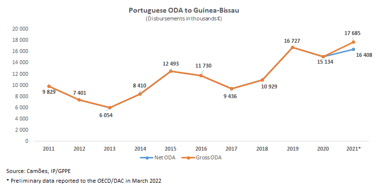 The downward trend in aid to Guinea-Bissau until 2013 has been reversed. In 2022, ODA to that country doubled compared to 2011, benefiting from budget support of €5 million and the donation of vaccines as part of the fight against the COVID-19 pandemic. In 2023 and 2024, however, the figures fell. In 2024, Guinea-Bissau was the sixth largest recipient of Portuguese ODA.