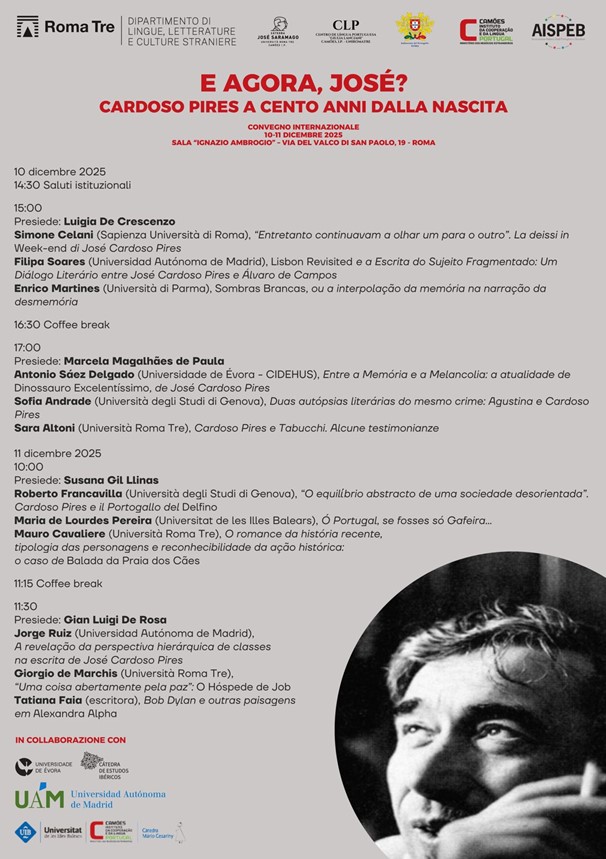 Por ocasião da celebração do centenário do nascimento de José Cardoso Pires, realizar-se-á na Universidade Roma Tre, nos dias 10 e 11 de dezembro de 2025, o Colóquio "E agora, José?". O evento é organizdo pela Cátedra Camões, I.P. José Saramago e pelo Camões - Centro de LÃngua Portuguesa Giulia Lanciani.