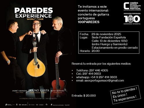 Entre os dias 29 de novembro e 4 de dezembro de 2025, a formação musical 100 Paredes, constituída especialmente para celebrar o centenário de nascimento do guitarrista Carlos Paredes, realizará três concertos na Argentina. A formação é constituída pelos músicos André Paredes, Bruno Costa e Nuno Botelho. Com vasta experiência em diversos tipos de experiências musicais, já dinamizaram inúmeros espetáculos em Portugal e a nível internacional (cerca de 15 países) no âmbito da celebração em causa, programação que se prolongará até março de 2026.