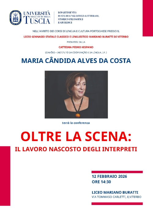 No dia 12 de fevereiro de 2026, às 14h30, terá lugar a conferência Oltre la scena: il lavoro nascosto degli interpreti ("Atrás do palco: o trabalho secreto dos intérpretes"), proferida por Maria Cândida Alves da Costa, no Liceo Mariano Buratti, em Viterbo.