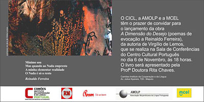 A Associação Moçambicana da Língua Portuguesa-AMOLP e o Camões-Instituto da Cooperação e da Língua (CICL), com o apoio da MCEL, patrocinam a sessão de apresentação pública da obra A dimensão do desejo (precedido de Utopia até morrer ou Entre a esperança e o sentido – poemas de evocação a Reinaldo Ferreira),do poeta Virgílio de Lemos, no dia 6 de novembro de 2012, na Sala de Conferências do CICL, às 18 horas.