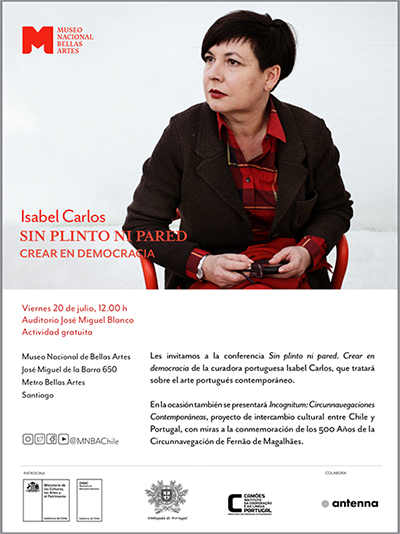Numa iniciativa que conta com o apoio do Camões, I.P. e da Embaixada de Portugal no Chile, a curadora portuguesa Isabel Carlos estará em Santiago no Chile, no dia 20 de julho de 2018, na qualidade de moderadora de uma palestra intitulada “Criar em Democracia” que versará, principalmente, sobre o debate da arte portuguesa no pós 25 de Abril.