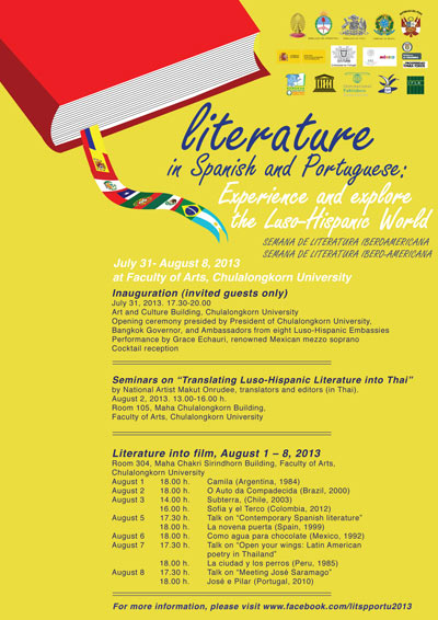 Numa iniciativa que celebra o seu estatuto de Capital Mundial do Livro em 2013, e em associação com alguns países ibero-americanos (Argentina, Brasil, Chile, Colômbia, Espanha, México e Peru), Banguecoque acolhe de 31 de julho a 8 de agosto uma Semana da Literatura em Português e em Espanhol.
