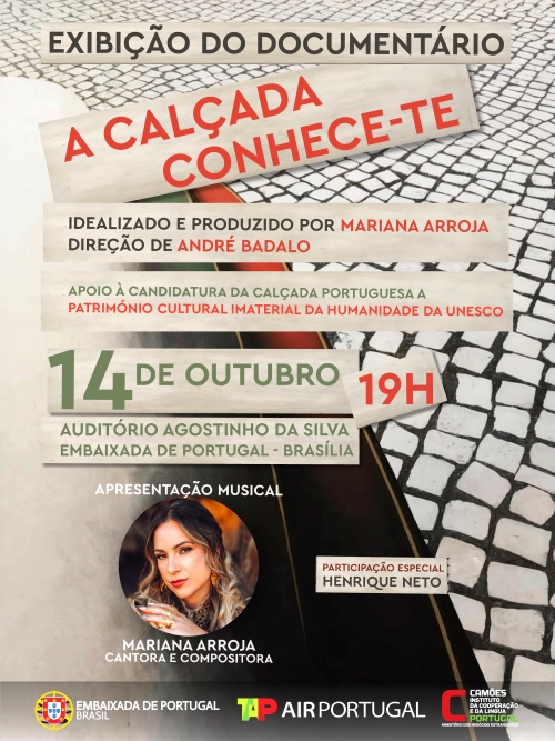 No dia 14 de outubro de 2025, às 19h00, o Auditório Agostinho da Silva, na Embaixada de Portugal em Brasília, acolhe Mariana Arroja, cientista, cantora e produtora portuguesa, para a apresentação do seu documentário e videoclipe “A Calçada Conhece-te”, obras dedicadas à arte e à simbologia da calçada portuguesa.