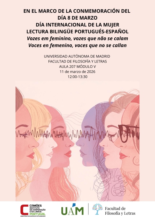 No âmbito das comemorações do Dia Internacional da Mulher (8 de março), no dia 11 de março de 2026, entre as 12h00 e as 13h30, terá lugar no Camões - Centro de Língua Portuguesa em Madrid, sediado na Faculdade de Filosofia e Letras da Universidade Autónoma de Madrid, uma sessão especial de leitura bilingue, em português e espanhol, intitulada “Vozes em feminino, vozes que não se calam / Voces en femenino, voces que no se callan”.